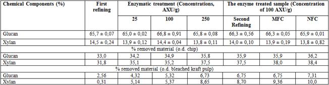 Alterations in chemical compositions of bleached kraft pulp after mechanical and enzymatical pretreatments and then homogenization were shown in Table 3. Mechanical pretreatment diminished the glucan (1,80% o.d. bleached pulp) and xylan (0,20% o.d. bleached pulp) contents. Varying enzyme concentrations applied in this study resulted in 65% (25 AXU/g) to 66,8% (100 AXU/g) (w/w) of glucan and 13,8% (250 AXU/g) to 14,4% (100 AXU/g) (w/w) of xylan contents. The studied enzyme concentration for further process was determined regarding the removal of glucan to xylan ratio. The determined concentration for further process was 100 AXU/g. This sample was mechanically pretreated again and the obtained sample had 66,3% of glucan and 14% xylan (w/w) in the structure. The samples were then homogenized and MFC and NFC were produced. Results showed that MFC and NFC had 66,3 and 65,9% (w/w) of glucan and 13,9 and 13,8% (w/w) of xylan in the structure, respectively.
