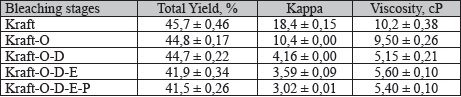 The yield, kappa and viscosity values of un/bleached kraft pulp are shown in Table 1. Ayata (2008) utilized the same wood species and pulping conditions, found similar yield, kappa and viscosity for the unbleached kraft pulp. Bleaching removed the lignin from the structure and it was noted that the kappa number and viscosity values decreased when the pulp was bleached in this study. A significant decrease in viscosity and kappa was observed when pulp was bleached with chlorine dioxide. This finding could be explained by lignin delignification and polysaccharide degradation during bleaching stage (Barroca et al. 2001). The NaOH (E) used in the bleaching stage in addition extracted some lignin as well as low molecular weight carbohydrates and consequently diminished the total yield. On the other hand, a slight increase in pulp viscosity during E stage bleaching (5,60 cP) was observed in this study. Similar finding was observed earlier by Islam (2004). This finding could be explained by the removal of some low molecular weight materials from the structure.