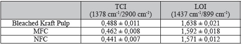 TCI is closely related to the crystallinity and the degree of the intermolecular bonds (Carrilo et al. 2004, Poletto et al. 2014). LOI has been used as an evidence for the presence of cellulose I in the cellulosic materials (Ang et al. 2012, Mandal and Chakrabarty 2011). Besides, cellulose II formation was observed in amorph structure after pretreatments (Oh et al. 2005). LOI and TCI were correlated with the overal degree of cellulose order (Poletto et al. 2014, Oh et al. 2005). Results showed that bleached kraft pulp had the highest TCI and LOI values revealing the highest crystallinity compared to MFC and NFC. On the other hand, MFC and NFC with lower cellulose infrared crystallinity indicated a larger number of amorphous domains in their structutre. This finding was also supported with 13C-NMR (46,2 ppm), which was substantiated with C6 peaks in the amorphous domain. The disorder of cellulosic structure may be due to the deformation vibration of β-glycosidic linkages and hydrogen bond rearrangements.