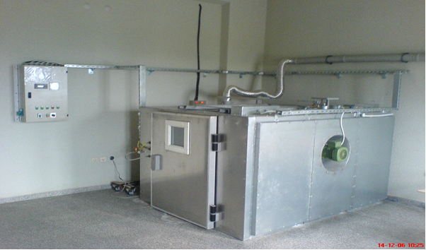 An automatic drying kiln with a capacity of 1 m3 and electrical heating was used for the trials (Figure 1). The kiln had three lumber moisture content sensors, an environmental temperature sensor, and an environmental equilibrium moisture sensor. The lumber moisture content sensors were mounted by drilling a 1,6-mm-diameter hole to the depth of measurement. In addition to these sensors, the kiln had an automated flap valve and an automated humidifying valve as measurement tools and accessories. These were all connected to the command panel. To determine appropriate drying schedules, pre-trials were carried out based on data from the existing literature (Boone et al. 1988, Simpson 1991, Simpson 1996). The drying process consisted of heating, main drying, and conditioning and cooling periods. The temperature and relative moisture content of the kiln were controlled automatically. The air speed was 3 m/s. Air was provided by a fan on the side of the kiln, and air circulated horizontally inside the kiln. The lumber drying oven had two ventilation chambers.