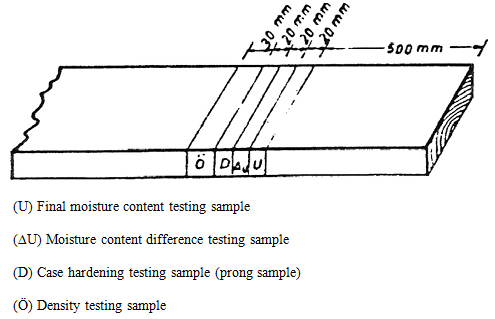The target final moisture content was set to 8% because the final indoor moisture content was 10 ± 2% due to the central heating that was used. The drying results were evaluated by quality control (characterization) tests (Boone et al. 1988, Simpson 1991, Simpson 1996). As recommended by the European Drying Group (E.D.G 1992), samples for testing were taken from a transverse section of the final quality control sample lumbers. The sampling positions were at least 500 mm from the end of the lumber (Figure 2).