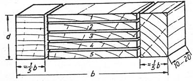 Samples that were the same size as the final moisture content testing samples were cut into five slices. The moisture content of each slice was found by the drying method, and the moisture content difference between inner and outer layers was determined by the following formula Equation 1 using outer layer samples 1 and 5 and inner layer sample 3, as shown in Figure 3 (TGL 21504, 1969).