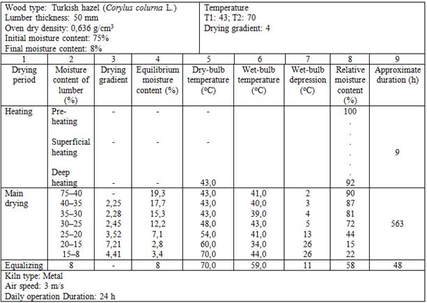 The protective drying schedule resulted in fewer end cracks and no superficial checks because of less warping and the lower moisture-content profile compared with the non-protective drying schedule. Therefore, this program is recommended as the optimum drying schedule for Turkish hazel (Corylus colurna L.) coming from the Kastamonu region at the industrial scale.