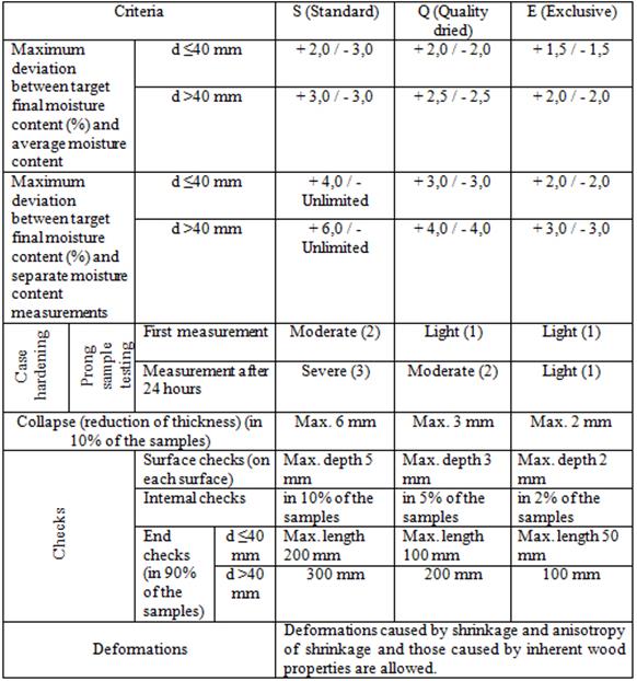 Before drying, defects of the final quality control sample lumbers were determined, and checks were marked on the lumbers. At the end of the drying process, the final quality control samples, which had been marked and numbered previously, were examined in a step-by-step process according to the following criteria (E.D.G 1992): moisture content (average moisture content, distribution of moisture content in each lumber and in the kiln in general, acceptable distribution width), drying checks (surface checks, inner checks, and end checks), drying tension/case-hardening, collapses, and deformations. Quality classes were determined by comparing the data obtained with the tolerance values of the E.D.G (Table 3).