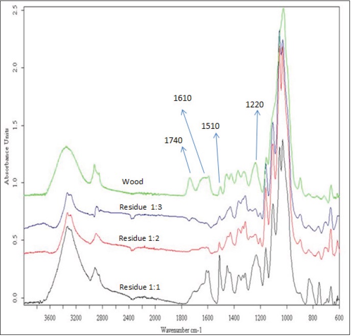In case of residues, the carbonyl peak intensity at 1740 cm-1 has almost disappeared indicating the dissolution of hemicellulose component of wood. The characteristic peaks associated with lignin (1510 cm-1, 1610 cm-1 , 1460 cm-1 and 1220 cm-1) have also shown marked reduction in the wood residues particularly obtained with 1:2 and 1:3 liquid ratios. Pan et al. (2007) has also reported disappearance of peak at 1735 cm-1 , attributed to the ester carbonyl group in xylan, in the FTIR spectra of the residues from liquefied wood. They observed reduction in the Klason lignin content and increase holocellulose and α-cellulose contents as the phenol to wood ratio (P/W) increased. At 1:1 liquid ratio, peak corresponding to aromatic vibration stretching are visible and this may be attributed to incomplete liquefaction of lignin components and also presence of phenol in the wood residues.