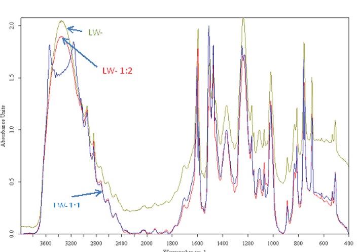 The spectra of wood polyols at different liquid ratio (Figure 2) differ significantly from the spectra of wood residues and wood (Figure 1) and shows that almost all peaks gradually become stronger with increase in liquid ratio i.e. from 1:1 to 1:2 and 1:3.