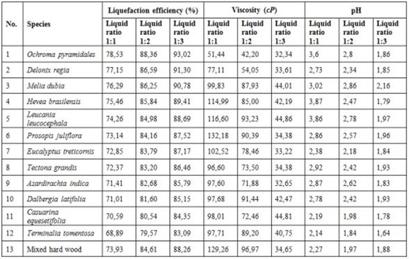 In this study, liquefaction efficiency of 12 tropical hardwood species and their mixture was determined using phenol as the liquefying agent and HCl as the catalyst. The liquefaction was carried out at different liquid ratio. The liquefied wood was characterized for properties like viscosity and pH. The wood characteristics namely wood density, ash content, extractive content, and lignin content were determined and related to liquefaction efficiency. The liquefied wood and residues were chemically characterized by FTIR spectroscopy.