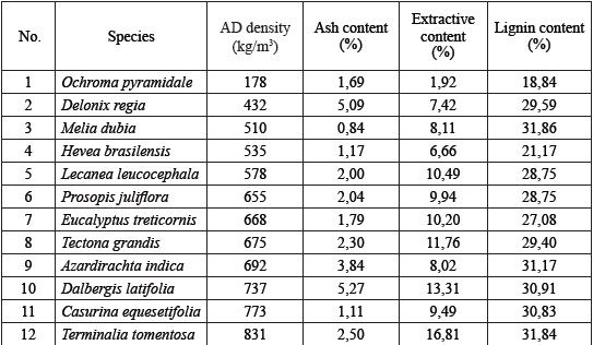 Wood characteristics namely air dry density, ash content, extractive content and lignin content of the species are given in Table 1. Wood density among the species was varying from 178 kg/m3 to 831 kg/m3. Ash content was ranging from 0,84% to 5,27% extractive content was ranging from 1,92% to 16,81% and acid-insoluble lignin content was ranging from 18,84% to 31,86%.
