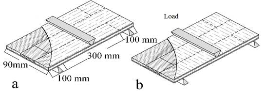 Three types of adhesive consisting of different ratios of melamine formaldehyde/urea formaldehyde resin (0:100, 25:75, and 50:50) were used to bond the face and back veneers to the 13-mm athel core. The adhesives, with a solids content of 70%, were uniformly separated onto one side of the face veneers at approximately 90 g/m2 by putty spittle. The end-to-end jointed athel core layer was then sandwiched between two veneers and pressed at 100 bar and 140 °C for 2 min in a hot press. Three specimens were each prepared with slats parallel to the outer layers (Figure 2a) and three specimens with slats perpendicular to the outer layers (Figure 2b).