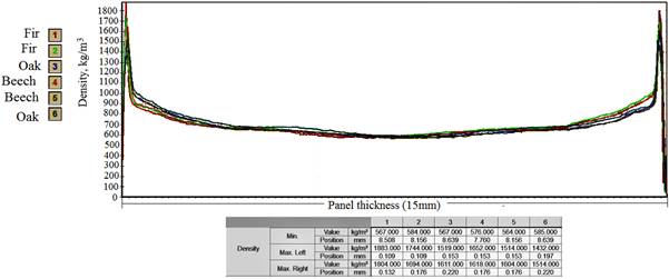 Density mean values, compaction ratio and density profile of samples before and after gluing process and press are shown in Table 1 and Figure 3. Air-dry density values ranged between 610 and 830 kg/m3. Panels covered with oak and beech veneer had the highest density values (830 and 810 kg/m3, respectively), however, it seems that big variations in density was experienced in the panels with fir ranging from 610 to 800 kg/m3.