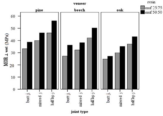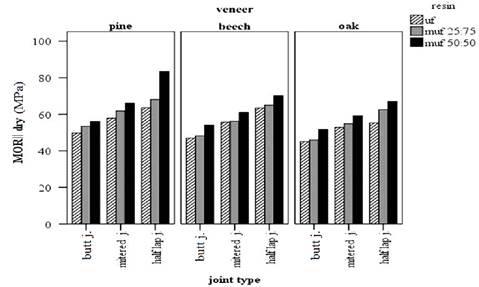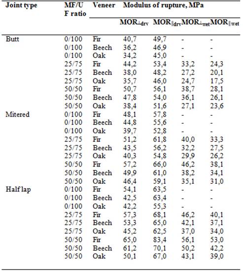 At a constant ratio of MF/UF resin and same joint type, using fir veneer resulted in higher values of MOR┴dry, MOR║dry, MOR┴wet and MOR║wet (52,07; 62,22; 28,95 and 24,12MPa respectively), while, specimens veneered with oak showed the lowest values (from 54,95 to 19,06MPa).