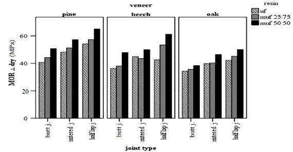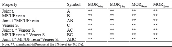 A multifactor variance analysis results displaying whether there are any differences between the modulus of rupture (MOR) values is given in Table 4. It was determined that the interaction between the main variables is significant with the 95% and 99% confidence based on the ANOVA analysis. Duncan test was used to show the difference determined with ANOVA. It was determined that MORs were affected by the type of joint in core layer (butt joint (at a right angle), mitered joint (at 30° angle) and half lap joint, veneer species (oak, beech and fir) and ratio level of MF/UF resin in glue line (0/100, 50/50 and 100/0), statistically.
