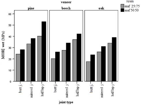 Specimens bonded with half lap joint (at a constant ratio of MF/UF resin and same veneer) showed a higher dry and wet MOR┴ and MOR║ values (52,34; 66,50; 30,56 and 27,30MPa respectively), and specimens bonded with butt joint showed the lowest values (40,68; 50,12; 20,80 and 15,55MPa respectively).