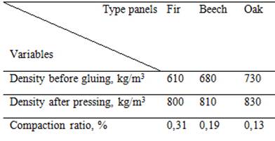 When a panel was veneered with fir, the tendency to increase in density was more significant than with beech and oak. Similarly, the compaction ratio of panels veneered with fir was higher than others. With respect to that, the thickness of the panels with the pressure applied depending on wood species, the reason for this stronger tendency to increase the density is related to the thickness loss of these panels due to the compression rate during hot pressing, and also an increase in resin-to-wood ratio.