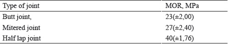 MOR of the tested slats fluctuated from 23 to 40MPa. Slats jointed with half lap joint showed a higher MOR values (40MPa), while samples jointed with butt joint showed the lowest value (23MPa). These results are in conformance with the studies in the literature (River 1994, Kapica 1986).