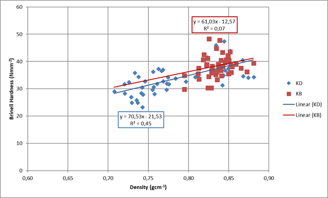 The regression between density and hardness was significant for KD samples (R2=0,45; P<0,0001), while it was not significant for KB samples (R2=0,07; P=0,06).