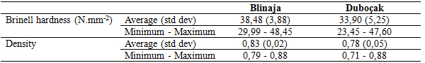 The average density and Brinell hardness values from KB were close to the ones obtained on a previous study of wood from the same region (Standfest et al. 2012a, Standfest 2012b): 0,86 for density and 39,92 N mm-2 for hardness. The average hardness values obtained for Q. cerris wood are lower than values reported for Q. faginea (50 N mm-2) or Q. suber (56 Nmm-2) but are nevertheless well within the required values for domestic flooring applications or commercial uses with moderate traffic (EN 14354-2004).
