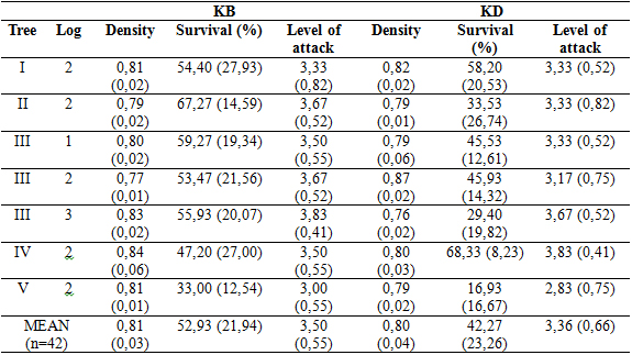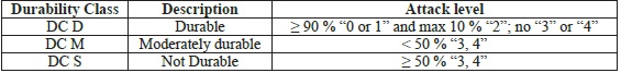 No significant differences were found between the Q. cerris heartwood samples from both sites. On average, the survival rate was 47,60 % and the level of attack 3,43. No significant correlation was found between wood density and rate of survival. The percentage of test specimens graded “3 and 4” was determined and found to be 90,5% for KD and 97,8% for KB. Taking into account the criteria defined by EN350 (2016) to assign a subterranean termite durability class (Table 1) to a certain species of wood, the heartwood from Q. cerris is classified as DC S (Not durable).