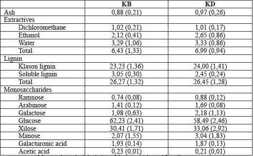 Chemical summative analysis included determination of ash, soluble extractives in dichloromethane, ethanol and water, Klason and acid-soluble lignin, and the monomeric composition of polysaccharides. A total of 12 test specimens from the heartwood (6 from KB and 6 from KD) with 50 x 25 x 15 mm were individually analysed following procedures adapted from TAPPI standard methods (TAPPI 2004).