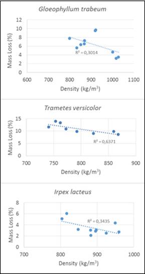 Previous studies have suggested a strong relationship between density and decay resistance for cocowood and oil palm. As noted earlier, density as well as sugar and starch content varies radially as well as vertically on the stem. These variations suggest that attempts to use palm wood require at least some degree of sorting for density, although they may also require some care to ensure that trees are cut in seasons where starch and sugar storage are reduced. The densities of the palm wood used in the current study had a relatively narrow range (740 to 1065 kg/m3), limiting the potential for examining the density relationship with decay resistance. Lower weight losses for blocks exposed to either O. placenta or the soil burial further limited comparisons. Plots of density vs mass loss for blocks exposed to either G. trabeum or I. lacteus did show slight trends for decreased mass loss with increased density, but the correlations were low (Figure 1). Correlations between mass loss and density were much better for T. versicolor (R2= 0,64).
