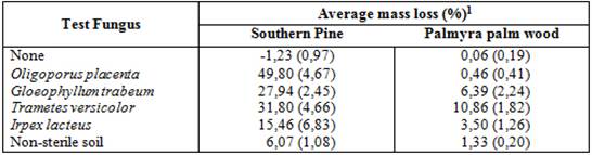 Palm wood samples exposed to O. placenta experienced less than 0,5% mass loss. Palm wood exposed to I. lacteus or G. trabeum experienced slightly higher weight losses averaging 3,5 and 6,4% respectively. Mass losses for blocks exposed to T. versicolor averaged 10,6%; however, these results must be compared with the understanding that they represent a longer incubation period. There are no specific standards for categorizing durability of wood in North America, but ASTM Standard D2017 categorizes durability on the basis of average mass loss in a soil block test (ASTM 2001). Highly decay resistant woods are those that experience mass losses averaging less than 10%. Palm wood would be classified as durable to highly durable under these criteria.