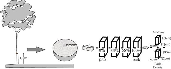A six cm thick disc was removed from each tree at 1,30 m from ground level. Four radial positions, pith to bark, were taken from the discs; close to the pith (0%), 33% and 66% from the ray, and on the periphery of the stem near the bark 100%, from which 2,0 cm3 test bodies were obtained for anatomical analysis and with 3,0 cm edges in the longitudinal direction (L), 2,0 cm in the radial direction (R) and 2,0 cm in the tangential direction (T) for density determination (Figure 1).