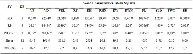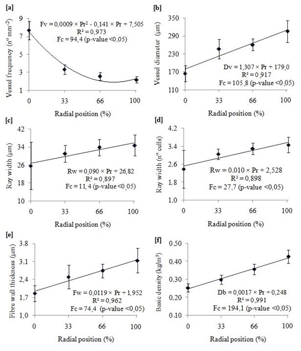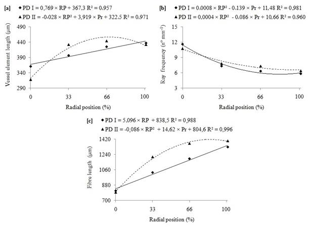 The radial variation of the wood characteristics, in which the effect of PD x RP interaction was not significant, is shown in Figure 2. There was a strong fit for the simple linear model for vessel diameter (r²=0,917), ray width in micrometres (r²=0,897) and number of cells (r²= 0,898), fiber wall thickness (r²= 0,962) and the specific gravity (r²= 0,991). However, for the vessel frequency, the quadratic linear model showed better fit (r² =0,973).