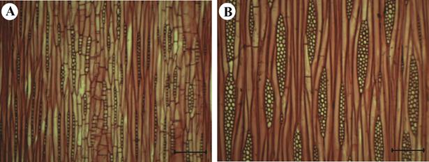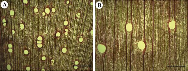 For species studied we observed significant radial variation, pith-bark, for most of the evaluated anatomical features, as well as for the basic density. The average value observed for the vessel frequency was higher than that reported by Silva et al. (2016) for the same species as in this present study, however, of native occurrence. For the vessel diameter, similar values were found. The radial association observed between increased vessel diameter and the concomitant reduction in the frequency has been described for hardwoods (Longui et al. 2011, Naji et al. 2013). For this present study we found that this effect was more pronounced in the vicinity of the pith, which may be related to the initial rapid tree-height growth, characteristic of pioneer species, since the vessel elements are strongly influenced by the decreasing auxin concentration gradient along the axial axis of the tree, where the wood produced far from the young leaves, which with the growth in stem diameter comprises the near-pith region, and produced in the opposite direction to the transport of water, tends to present larger and less frequent vessels (Aloni and Zimmermann 1983, Aloni 2013, Sorce et al. 2013). Schuldt et al. (2013) and Zhao (2016) also confirm that during growth, the tree adjusts its anatomical structure, changing, for example, the size and frequency of the vessels to maximize hydraulic conductivity, thereby minimizing the vulnerability of xylem and ensuring mechanical security.