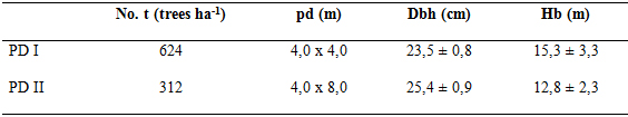Five trees were collected in two different initial planting densities (PD), totaling ten trees sampled (Table 1).