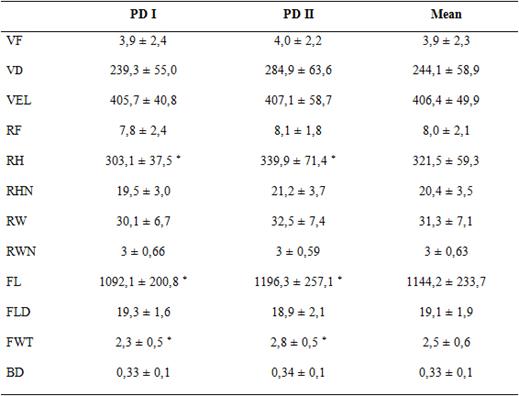The Table 3 presents the descriptive statistics data and also the multiple comparison of averages conducted for the characteristics evaluated in the initial planting densities. In DP II the broader spacing adopted provided a significant increase of the ray height, 12,2% and of wall fiber length and thickness 9,5 and 21,7% respectively.