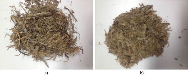 A banana plantation in Portugal provided the raw material used in this study. The banana (Musa acuminata.) stem chips were prepared from mature trees approximately 25 years old. The banana trees selected for making particleboard chips were generally 10-11 m in height while the stem diameter ranged between 20 and 40 cm. The stems were cut into slices (ca 20 cm long) and chipped in a hammer mill. For comparative reasons, wood chips were also used. Each furnish type was screened first through a mesh with 5 mm apertures to remove oversize particles (Figure 1a left) and then through a mesh with 1 mm apertures to remove undersize (dust) particles.