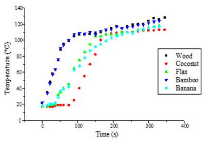 Figure 2 presents typical core temperatures in the banana particleboard mats and in particleboard mats made from industrial wood chips. It can be seen that the rate of heat transfer to the core was different in the two mats, being significantly slower in the banana panel. This is probably related to the lower bulk density of the banana furnish and consequent reductions in mat permeability upon densification during hot pressing. Similar behaviour was also observed by previous workers in particleboards made from coconut and flax residues (Papadopoulos and Hague 2003, Papadopoulos et al. 2002).