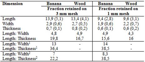 When screened over the 3 mm mesh, approximately 30% of the banana furnish was retained on the mesh. This is in line with the results for the wood chip furnish, where less than a third was retained on the mesh and contrasted with previous results with bamboo and flax furnishes, where more than half of the bamboo and flax furnish was retained on the mesh (Papadopoulos et al. 2004, Papadopoulos and Hague 2003).