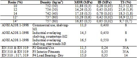 When we look at the data in light of industry standards, we see that particleboards bonded with 14 % resin conformed to the more stringent requirements of class M-3, as far as the mechanical properties are concerned, while their TS values were far below the standards. However, the British P3 interior fitment board criteria were satisfied at a dosing rate of 12% UF. The P4 load-bearing panel, however, required 14% of resin to satisfy the mechanical properties, while the TS remained a problem, even when the resin was increased to 14%.