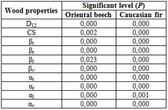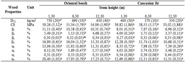 The mean and standard deviation values for each stem height, and summary of variance analysis for air dry density, compression strength, shrinkage and swelling of oriental beech and caucasian fir are given in Table 2 and Table 3.