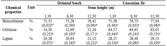 Analysis of variance showed that there were significant differences (P<0,05: P<0,01) among the stem heights for both wood species (Table 6). Hemicellulose, cellulose and lignin are the constituent polymers of wood, and are responsible for most of the physical, chemical and strength properties of wood and wood products (Pandey 1999). The lowest holocellulose content of oriental beech and caucasian fir was 75,28% at 6,30 m and 75,38% at 1,30 m, respectively. While the holocellulose content of oriental beech increased from 6,30 m to 12,30 m stem height, the holocellulose content of caucasian fir increased from 1,30 m to 12,30 m stem height. Campbell et al. (2007) found that the holocellulose content in both varieties of lodgepole pine increased to about 20-30% stem height, they stated that this increase is possibly related to the higher percentage of hemicellulose in the juvenile wood in the top of the tree. The lignin content showed an increasing trend with increasing stem height, reached highest amounts at 12,30 m in both wood species. Campbell et al. (2007) observed the lignin content in both varieties of lodgepole pine increased from 0% to 20% stem height and then remained stable at higher stem heights. They stated that the increase in lignin with stem height is possibly related to higher percentage of juvenile wood in the upper stem. Moreover, Zobel and Sprague (2012) stated that juvenile wood is comprised nearest the pith at all heights in the tree and the tops of trees, regardless of tree age, have mainly juvenile wood. In contrast to the increasing trend in holocellulose and lignin content, cellulose content of oriental beech and caucasian fir decreased from 54,30% at 1,30 m to 51,26% at 12,30 m and 64,57% at 1,30 m to 63,01% at 12,30 m stem height, respectively. A decrease in the alpha-cellulose content of latifolia, which is the variety of lodgepole pine, was reported by Campbell et al. (2007). Furthermore, they concluded that the decrease in alpha-cellulose with stem height is associated with an increase in juvenile wood, an increase in hemicellulose, and a decrease in specific gravity. In the present study, the decrease in wood density and compression strength with increasing of stem height for both wood species can be related to the decrease in cellulose content with stem height. As known, cellulose is the main chemical component (Neagu et al. 2006), and one of the function of the cellulose is to provide the required strength in plant cells (Khalil et al. 2015). Moreover, Bergander and Salmén (2002) concluded that the elastic properties in the longitudinal direction of the cell wall are almost only determined by the elastic constants of cellulose.