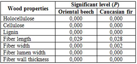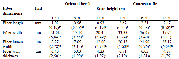 Fiber dimensions of oriental beech and caucasian fir are shown in Table 5. Significant differences were observed in fiber dimensions among stem heights (Table 6).