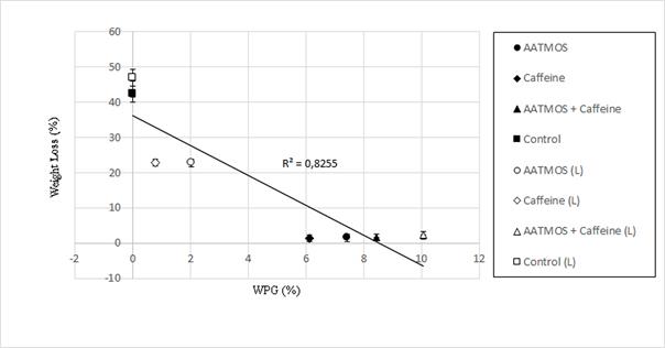 The relationship between WPG due to treatment (and leaching) against percentage weight loss (WL) of wood following exposure to C. puteana is shown in Figure 1. Data points represent the average of five repetitions of each variant examined. The fit shown by linear regression analysis indicates a positive relationship between the effectiveness of the treatment with AATMOS, caffeine and the mixture thereof and decay resistance. The data show that WPG of approximately 8,5% is required following treatment (and leaching) to ensure antifungal protection, irrespective of the composition of the impregnation mixture used.
