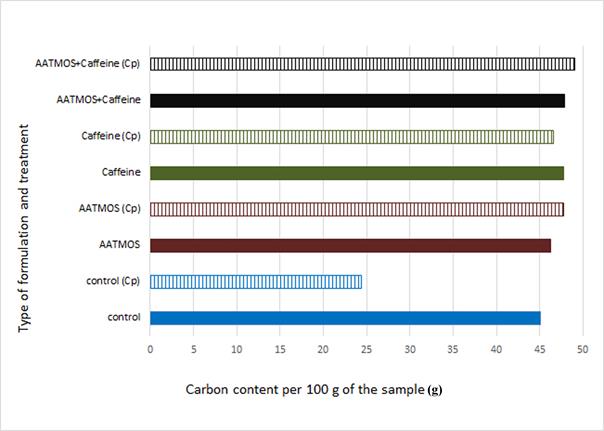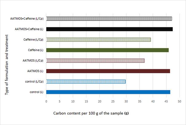 Comparing carbon content in the unleached treated wood samples before and after exposure to C. puteana, no major differences were observed. This can be explained by the high resistance of the treated wood to biodegradation. Lack of mass losses following exposure to wood destroying fungus resulted in similar CC in comparison to the state before the mycological test. By contrast, quite a large difference was observed between leached wood samples before and after exposure to C. puteana. Leaching of AATMOS and caffeine from wood resulted in its increased susceptibility to fungal degradation, which caused weight loss of the wood samples of about 22%. As a consequence, the lower carbon content was observed in the respective wood samples (36,8 g and 39,1 g per 100 g of IMWS) in comparison with their counterparts not subjected to fungus activity (CC of 46,3 g and 45,8 g per 100 g of IMWS, respectively). As demonstrated by Diyarova (2016), large amounts of carbon dioxide are emitted during fungal degradation. For instance, in the case of wood samples with a moisture content of about 50% exposed to fungal decay at the optimal temperature for fungal growth of about 22ºC, the CO2 emission of around 0,8-1 mg per dm2×h-1 was registered, resulting from decomposition of wood structural components and microbial respiration. Taking into consideration the time of mycological test described herein, this explains a decreased carbon content in decayed wood samples. In turn, no difference in carbon content was observed in the case of leached wood samples treated with the impregnation mixture of AATMOS and caffeine before and after exposure to fungus (47,4 g and 47 g per 100 g of IMWS), similarly to unleached samples. This could be explained by the high resistance of treated wood samples to fungal degradation resulting from the effectiveness of the mixture used, regardless of whether the accelerated leaching was applied.