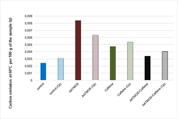 In general, higher carbon emission at the temperature of 60°C was observed from the samples degraded by fungi in comparison with those not exposed to the fungus. It was due to the fact that fungal degradation weakened chemical interactions within wood components, making them more susceptible to further decomposition (and carbon release) due to increased temperature. In the case of AATMOS-treated wood and untreated leached wood, the situation was the opposite. From among treated wood, the highest carbon emission at 60°C was observed from samples treated with 5% AATMOS, both leached and unleached (0,0062 g and 0,0083 g per 100 g of IMWS). In turn, the lowest carbon emission values, ranging from 0,0033 g to 0,0046 g per 100 g of IMWS, were obtained for all wood samples treated with the mixture of AATMOS and caffeine (leached and unleached, before and after exposure to fungus). This could result from the interactions between the mixture components with themselves and with wood, making the wood more durable (with carbon strongly linked within wood components).