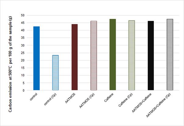 Among the decayed wood samples, the lowest carbon emission (ranging from 23,3 to 36,5 g per 100 g of IMWS) was observed from those which were most susceptible to fungal degradation, that is leached and unleached untreated wood and leached wood treated with individual compounds: 5% AATMOS and 2% caffeine. It resulted from the lowest carbon content in these wood samples as a consequence of mass loss of wood (and the loss of carbon) due to fungal degradation. On the contrary, due to their high resistance to fungal degradation, the highest carbon emission was registered from the unleached treated samples (about 46 g per 100 g of IMWS). Special attention should be given to wood samples treated with the mixture of AATMOS and caffeine after exposure to fungi. They showed the highest carbon emission at 500°C, regardless of whether they were subjected to accelerated leaching prior to the mycological test or not (44,4 and 47,5 g per 100 g of IMWS, respectively). This confirms the observations from the previous analysis described above and points to possible interactions between the two chemicals and wood components, resulting in higher carbon “fixation” in wood treated with this impregnation mixture.