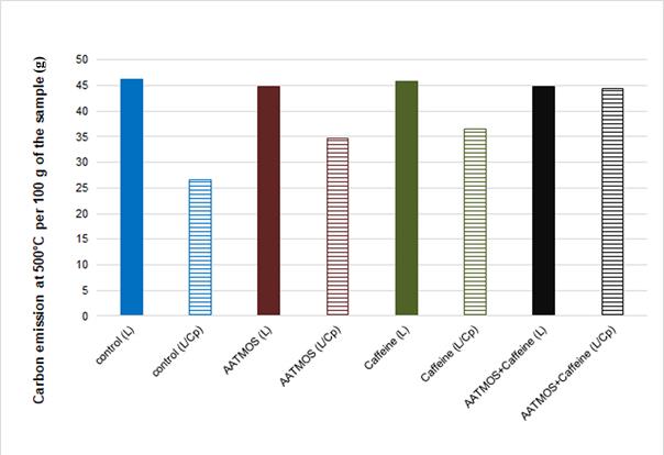 All the wood samples (untreated and treated) that were not exposed to fungal degradation showed high carbon emission (about 45 g per 100 g of IMWS) at the temperature of 500°C.