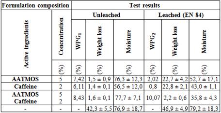 Various resistance of wood against the tested fungus was observed depending on the preserving formulation used (impregnation mixture of caffeine and AATMOS or its individual components) and application of accelerated leaching procedure (Table 1). Pine wood treated with an aqueous solution of 5% AATMOS showed antifungal resistance at a weight loss (WL) level of 1,3% and 21% for unleached and leached samples, respectively. The difference between WL values clearly indicates high leachability of AATMOS from wood, which suggests low reactivity of this substance with wood components. Similarly, wood treated with an aqueous solution of 2% caffeine also showed higher antifungal resistance without ageing procedure (WL before leaching was 1,4% and after leaching - 20,7%). This confirms low caffeine reactivity with wood resulting in its high leachability. In turn, wood treated with the impregnation mixture of the components showed high antifungal resistance both before and after accelerated leaching. WL after exposure to C. puteana was 1,7% and 2,4%, respectively.