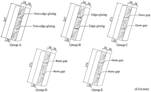 The CLT shear block specimens were fabricated using No. 2 visual grade spruce-pine-fir (SPF) lumber pieces imported from Canada. The dimension of the lumber pieces was 38 mm (thickness) × 89 mm (width) × 2,44 m (length). The lumber pieces had a mean density of 470 kg/m3 and an average moisture content of 14,2%. One-component polyurethane adhesive (Purbond HB S709) was used for face and edge gluing of the three-layer CLT test specimens. The three-layer CLT shear block specimen consisted of lumber three pieces in the cross layer, which was supposed to simulate the specimen cut directly from a full-size CLT panel. Five groups of specimens were prepared with cross layers being edge-glued and without, and with gaps of 2 mm, 4 mm, 6 mm, which were labeled as group A, B, C, D, E, respectively. The dimensions and configurations of each group are shown in Figure 1. Due to the gaps in group C, D, and E, the top and bottom layers were slightly longer than those in group A and B. The lumber pieces were pre-cut and then pressed with a pressure of 1,0 MPa, an adhesive spread rate of 180 g/m2 and a pressing time of three hours under the environment temperature between 20 and 25 °C. Wood chips of 2 mm, 4 mm and 6 mm wide were prepared and inserted between the lumber pieces in the cross layers for group C, D, and E, respectively, to ensure the gap size during pressing. Side pressure was applied with a clamp to restrain layer movement under vertical pressure. Ten replicates were prepared for each group