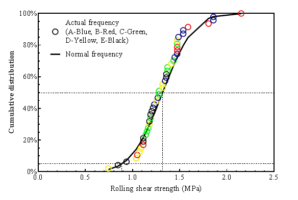 The cumulative distribution of all test results of three-layer SPF CLT is shown in Figure 3. The rolling shear strength of SPF CLT tested falls between 1,0 and 1,6 MPa with only three test values lower than 1,0 MPa. The result is 8,3% lower than the mean value of 1,44 MPa for the same No. 2 grade SPF in (Gong and Chui 2015). Moreover, the characteristic rolling shear strength, i.e. the 5% quantile value, was 0,88 MPa with a confidence interval between 1,24 and 1,34 MPa at the confidence level of 95% according to the nonparametric approach in ASTM D2915-10 (ASTM 2010). In current CLT design guides and codes, the characteristic rolling shear strength is 0,5 MPa for SPF CLT in Canada (Sylvain and Marjan 2011), while in Europe, the characteristic rolling shear strength is recommended 1,1 MPa for both edge-glued softwood CLT and non-edge-glued CLT made of laminations with a minimum width-to-depth ratio of 4, otherwise 0,7 MPa should be used (BS EN 16351, 2015). The above results of rolling shear strength of the CLT specimens in this study indicates that the current design values of 0,5 MPa of SPF CLT is conservative regardless of edge-gluing and gaps.