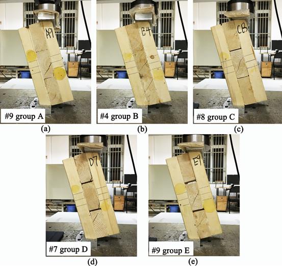 Typical failure modes of five CLT specimen groups tested were shown in Figure 6. They were all observed to be ductile failure mode regardless of edge-gluing and gap size. Generally, no obvious differences in failure mode were found among the five CLT groups. Three typical failure mechanisms were observed during the modified planar shear tests. The first and most common failure mode was the so-called rolling shear failure shown in Figure 5(c). The cracks were initiated suddenly and propagated along the growth ring. With the shear stress induced perpendicular to the longitudinal direction of CLT, a friction surface is created along the transition from early wood to latewood within a growth ring. Due to the different resistance to shear stresses of early wood and latewood, the increasing shear stress caused the rolling of wood fiber in a single growth ring and finally spread to adjacent layers. The crack(s) stopped at the bonding surface between the outer layers and cross layer causing the final fracture of the test specimen. The second type of initial failure mode usually happened for CLT specimens with cross layers having pith as shown in Figure 5 (a), Figure 5 (b) and Figure 5 (e). With the load approaching peak load, a crack or cracks would suddenly initiate around the pith and then propagated along the growth ring or wood ray direction, which was the primary failure mode for such CLT specimens. It is known that wood pith mainly consists of parenchyma cells and has relatively low mechanical properties. The third failure mode was the shear failure found wood ray as shown in Figure 5 (d). Wood rays always consist of one or two rows of parenchyma cells, which can be a weak zone that cracks are caused by the tension stress perpendicular to grain and propagated along the wood ray direction. During the actual tests, the initial failure may be caused by one of the above described mechanisms, however, with the increase of either load or displacement, the combination of three different failure modes can be observed in the cross layers of a specimen due to very complicated stress redistributions. The findings here agree with the failure mechanisms reported by Nie (2015), who recorded the detailed failure process of CLT cross layers with high speed camera and categorized the initial failure modes into three types, tension perpendicular to grain type, rolling shear type and marginal type.