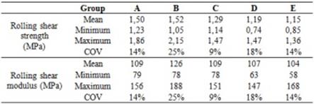 The summary of rolling shear strength and modulus of all the test groups is presented in Table 1. Overall, the mean rolling shear strength of NO. 2 visual grade SPF was 1,32 MPa with a coefficient of variation (COV) of 20%. Its mean rolling shear modulus was 111 MPa with a COV of 28% in this study. Detailed results and discussion are presented in the following sections.