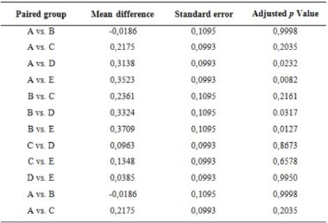 With an in-depth investigation of the measured values of each CLT group in Figure 4, differences can be observed among five CLT groups, especially between CLT with gaps and without gaps. The mean values of rolling shear strength decrease if the lumber pieces in the same layer were not edge-glued, and the strength value decreases with the increase of gap size. In the one-way ANOVA test of all five groups, a p value of 0,0012 was obtained and a subsequent Tukey’s multiple comparisons test was conducted. In Table 2, with a confidence level of 95% and a cutoff p-value of 0,05 there is no significant difference among the mean values of groups A, B and C, and among groups C, D and E, while a significant difference is observed between A and D, A and E, B and D, B and E. Therefore, there is no significant difference of rolling shear strength between edge-glued CLT and non-edge-glued CLT without gaps or with gaps less than 2 mm. While the with the increase of gap size from 2 mm, 4 mm to 6 mm, such difference becomes significant compared with edge-glued CLT and non-edge-glued CLT without gaps. The results to some extends proved the recommendation on a reduced characteristic rolling shear strength for non-edge-glued CLT product in BS EN 16351-2015. The reason for a reduced rolling shear strength due to gap size could be attributed to the increased stress concentration level as well as the redistribution of shear stress with the existence of gaps, which may cause the weak zones in the cross layer, namely early wood or pith, become prone to fail (Ehrhart et al. 2015).