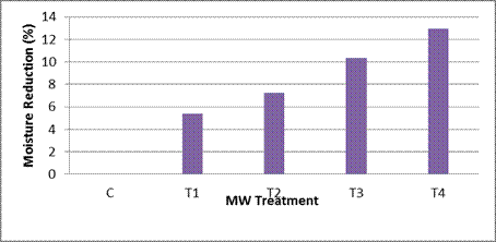 Increased MW treatment intensity resulted significant difference (p≤0,05) in moisture reduction from the initial values. The intensity level of the MW energy had generated steam within the wood cell that resulted removal of MC from wood (Vinden et al. 2010). The removal of steam through pores could be seen visually when specimens were removed from microwave assembly.