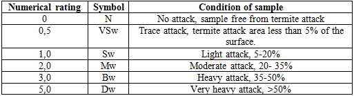 The samples were cut into test specimens (100 × 25 × 6 mm). The test specimens were buried at different places inside a termite mound of Odentotermes obesus (Rambur) in the beginning of month of May. Specimens were removed from the mound in November when activity of termites almost ceases due to fall in temperature. The specimens were visually examined for termite attack and reinstalled next year in month of May so as to have exposure to termites for two successive termite seasons. Specimens were cleaned off mud and debris, and evaluated visually to ascertain damage by termites, according to the following rating scale given in Table 1 (Shukla 1977).